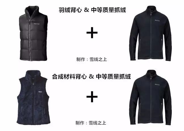 4、合成材料背心,羽绒背心搭配中等质量抓绒。