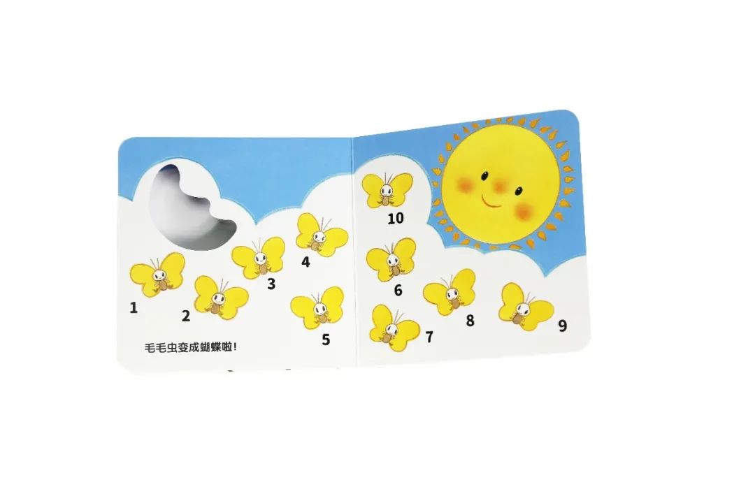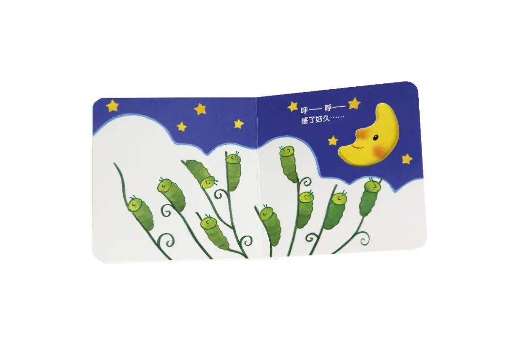 到了晚上,月亮出来了,毛毛虫们睡觉了,可是你以为这样就结束了嘛?第二天早上起来,太阳出来了,10只毛毛虫变成了10只小蝴蝶。