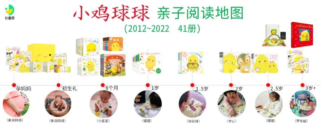 接下来,我先给大家画一幅“小鸡球球亲子阅读地图”,以年龄为横坐标,标出了小鸡球球各套产品应该出现的节点。