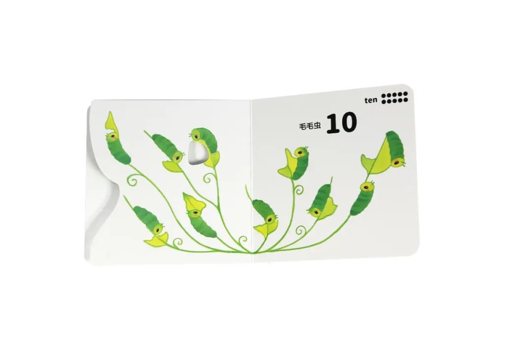 比如《数字》这本,洞洞被设定成了小鸡球球一路出去溜达,场景切换的任意门;数字10这页,图画是10只毛毛虫;