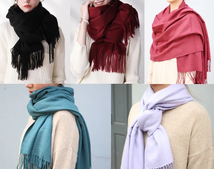颜色一共有5个,黑色、酒红、米兰红、雀尾兰、和紫色。黑色和红色都是百搭的秋冬色,紫色也是今年的流行色,总有一个适合你的颜色。除了羊绒围巾,同品牌的羊毛围巾也非常不错,菜菜就一次给你们推荐了!顺便先跟你们说一下羊毛和羊绒怎么选: