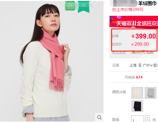 38.9%阿拉善羊绒+61.1%粘纤,手感甚至比纯羊绒还顺滑一些。总重量320g,算下来羊绒足足有136g左右,直逼优衣库的纯羊绒围巾的羊绒克数啊!围巾的尺寸也更大68X200cm(含流苏,优衣库33X176cm),是我偏爱的较大尺寸的围巾。当披肩、当开衫、当斗篷、当裙子、当办公室小毛毯......都很实用~没错,比优X库更好的羊绒围巾,定价却只要它的1/3!绝对买到赚到。双11没有入手围巾的小伙伴,买它就对了!