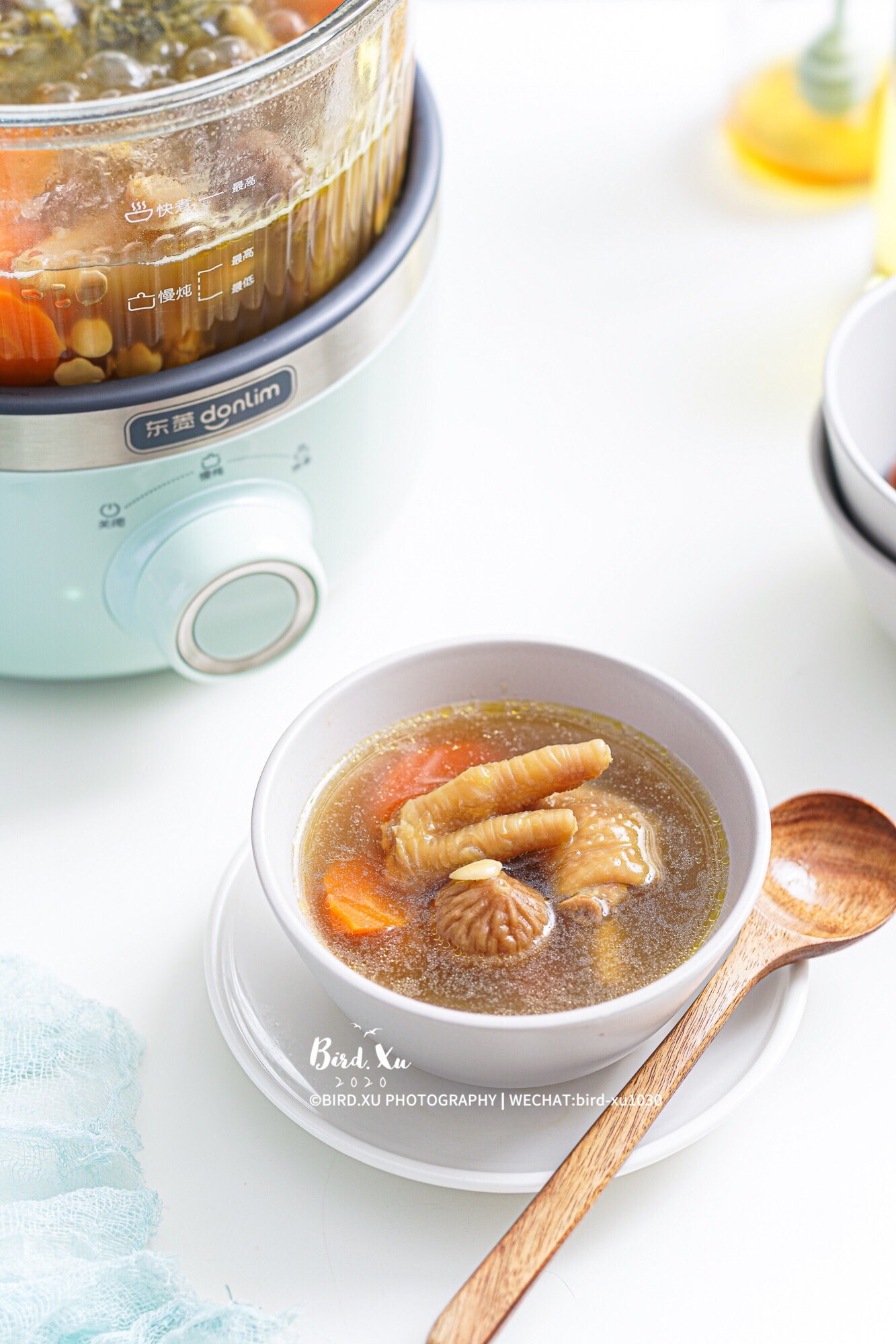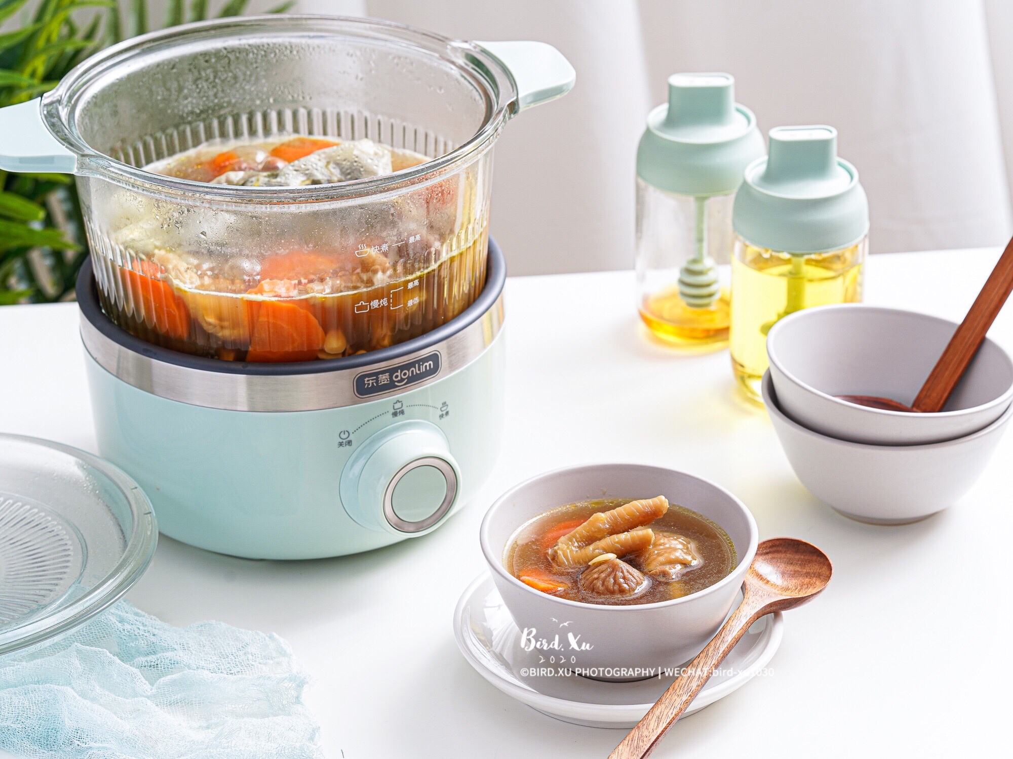 4. 可以先用快煮模式,将水烧开,再转慢炖档,煲上2小时。切忌不要超过2小时,会有嘌呤。