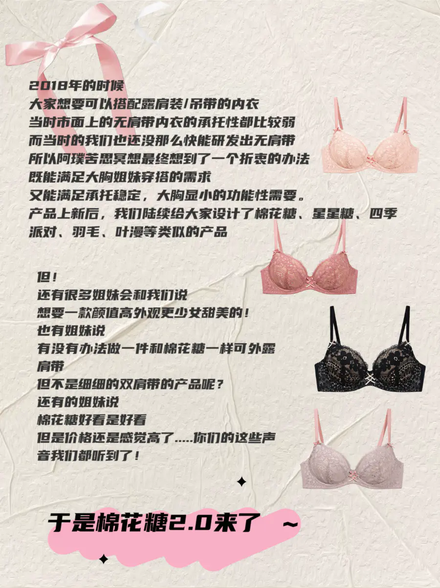 2018年的时候,姐妹们想要可以搭配露肩装/吊带的内衣,阿璞苦思冥想最终想到了一个折衷的办法,既能满足大胸姐妹穿搭的需求,又能满足承托稳定,大胸显小的功能性需要。