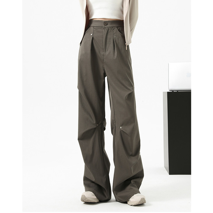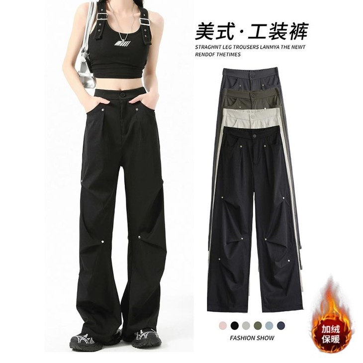 文案:黑色铆钉工装裤帅炸了💥铆钉打褶设计质感拉满,穿上后也不会很浮夸,小个子、梨形、微胖无脑入,随意搭都很潮酷!