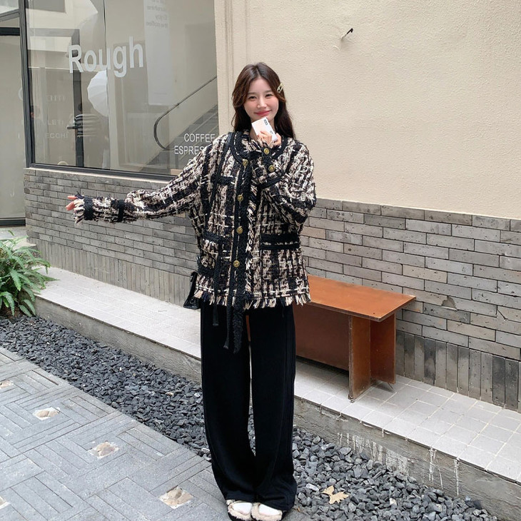 文案:财阀大小姐般的气质真的抵挡不住 ~流苏毛边设计穿出门也不会撞款☑️特制金属纽扣,气质中自带一份矜贵!