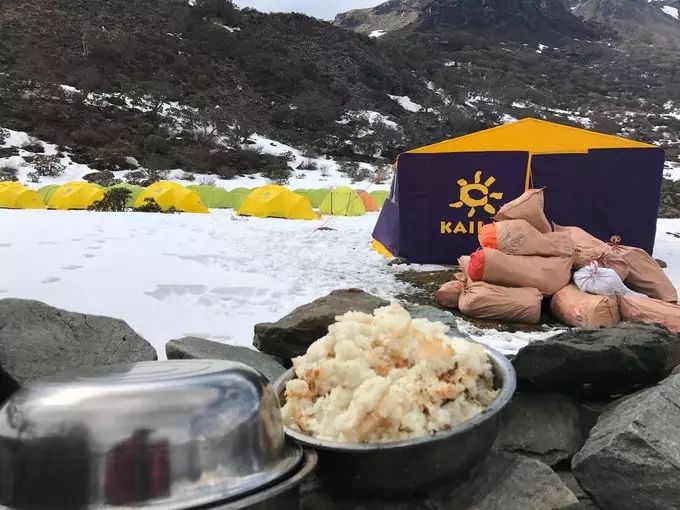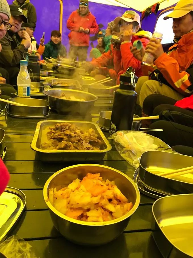 晚饭就是这半生不熟的米饭,好在有牦牛肉,不管好不好吃,我们需要能量,需要补充体力。热水也烧不开,都是用雪水满满融的,但对我们而言,只要有一点点温度就已经很满足了。