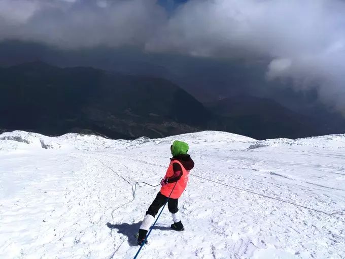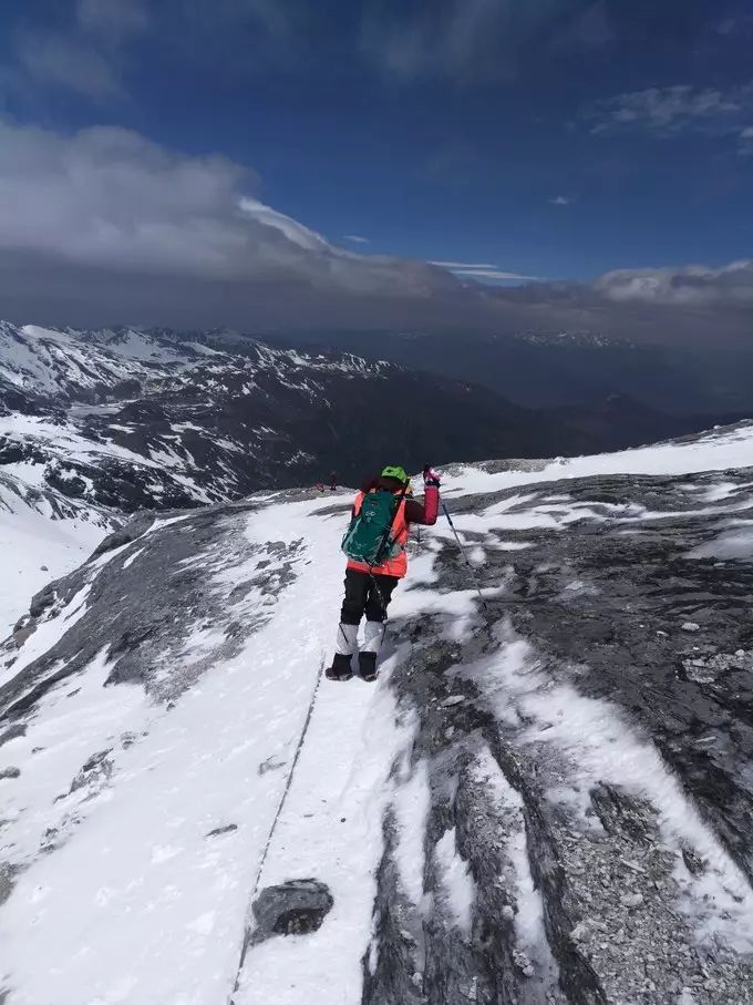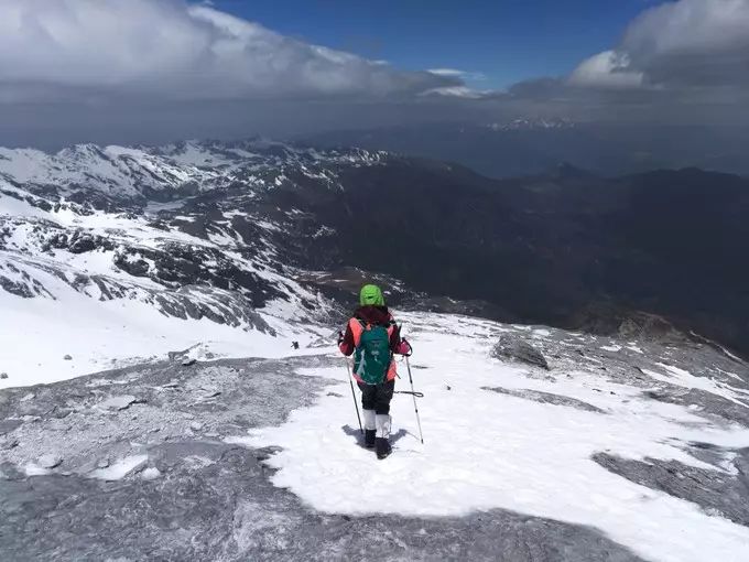 29日凌晨3点出发开始冲顶(大本营-大石板4200m-C1营地小丫口4900m-绝望坡-月亮湾-顶峰海拔5396m),10点登顶后开始下山,16点从大本营下山回到哈巴村;