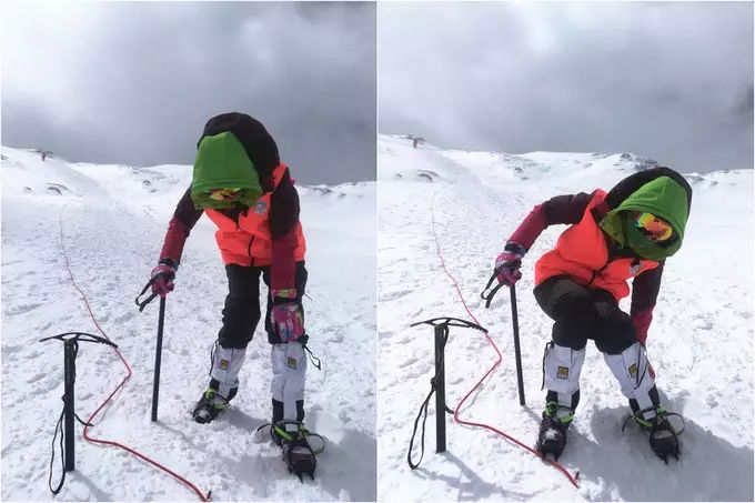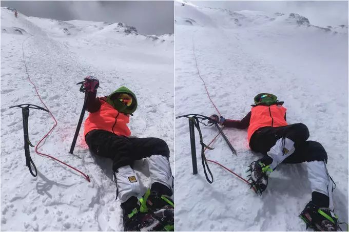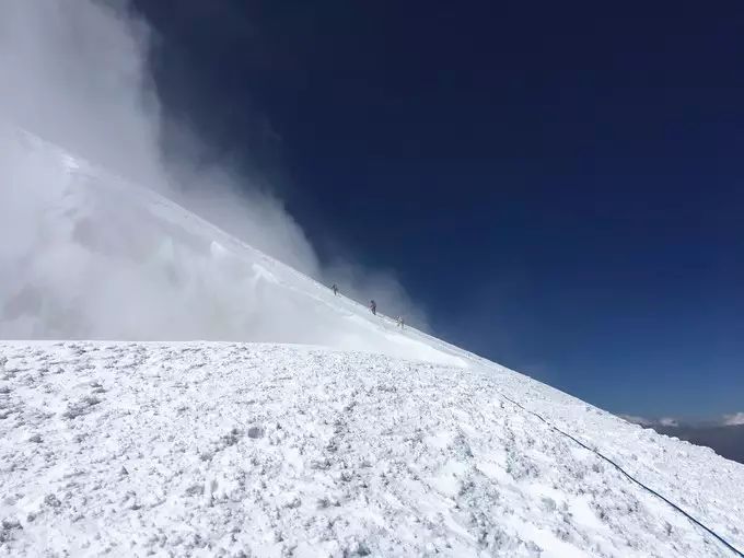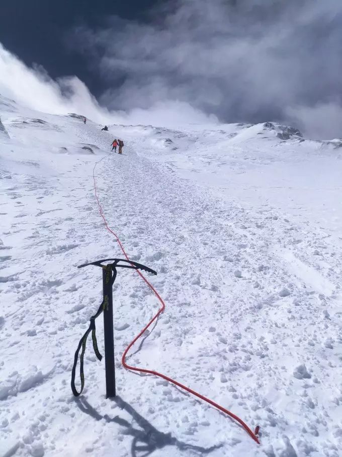 然而我们就这样一步一步地到达4900m,在这里需要穿上冰爪,带上冰镐,扔下登山杖。在这里需要吃点补给,补充体力,做好充分准备,如果想下撤还来得及,但如果决定继续,那就一冲到顶,不然没意义。