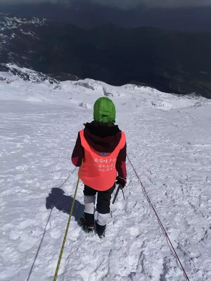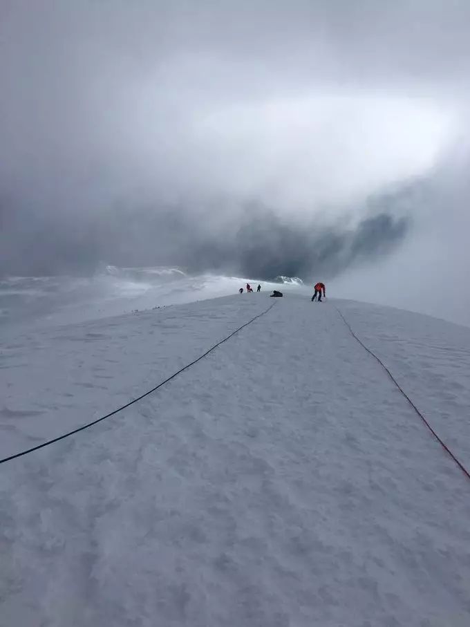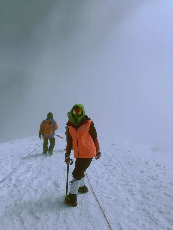 又遇风雪,前方的路都看不清,隐约看见我们的向导走在前方带路,这种感觉神秘又刺激。同时也给还在继续向上爬的队友们加油,鼓劲。