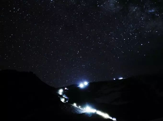 我们分三个时间段出发,凌晨3点、3点半、4点,这样分散开来冲顶,夜空的星星为我们照耀前行的路。