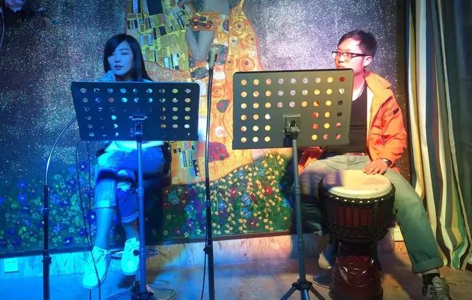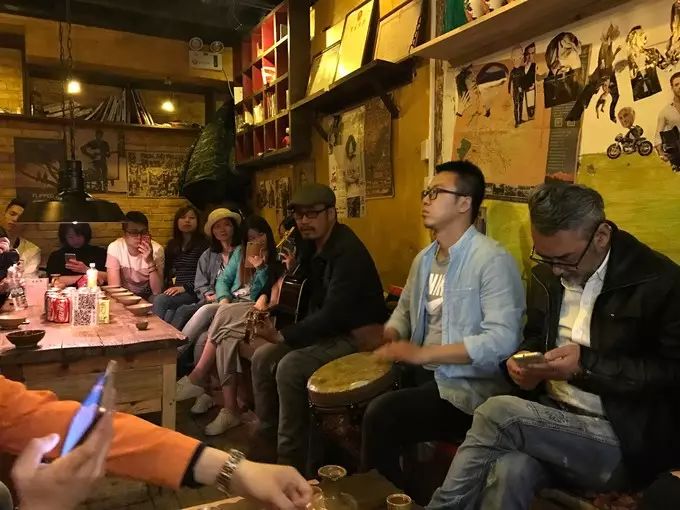 晚上当然是来大军手鼓店听大军打鼓唱歌啦,还有靳松也在,四十元一瓶酒的门票还是很划算的,大家一起聊聊天、喝喝酒、唱唱歌,哦对了,今天五一劳动节,大家一起搞个联欢吧!我负责配合打鼓,男票负责门口帮忙推荐唱片,还是有模有样的嘛~