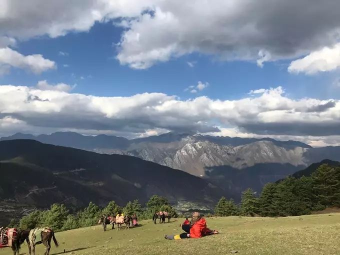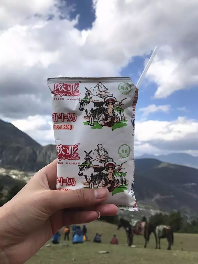 在大本营也没有久留,因为还是没有饭吃,必须继续下到哈巴村,双腿实在没了力气,这时都已经下午三点了,下山伤膝盖,疼得要命,只好定一匹骡马骑下山去。带我的背夫还送我一袋大理特色牛奶给我补充能量,那时觉得是这辈子喝过最好喝的牛奶了~