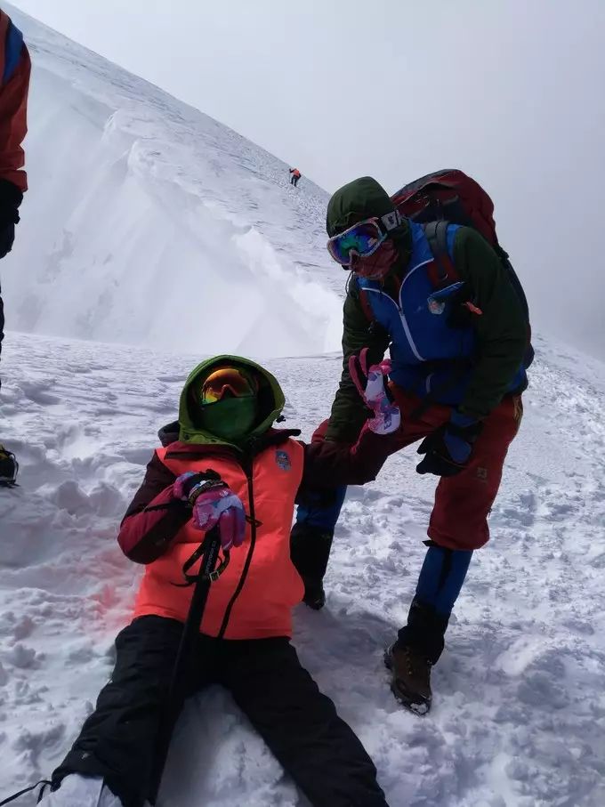 对于平时从不锻炼的我来说,登山的过程实在是吃力,天气也着实不太给力,时而风雪交加,时而雹子漫天飞,向导时不时地问我是否ok,需不需要下撤,一切都要安全为重。当时气温有-15到-20度,风力大约在10级左右,我几番被吹倒下滑,有时走一步要停留十几二十分钟就为了等风稍微减缓。加上呼吸有些困难,裹着的头巾实在难受,就把鼻子和嘴巴露在外边,即便冻僵了也没有办法,根本分不清脸上是鼻涕还是口水了。条件可以说万分恶劣,向导说如果到达C1还是这种天气,就必须全体下撤,无法登顶。