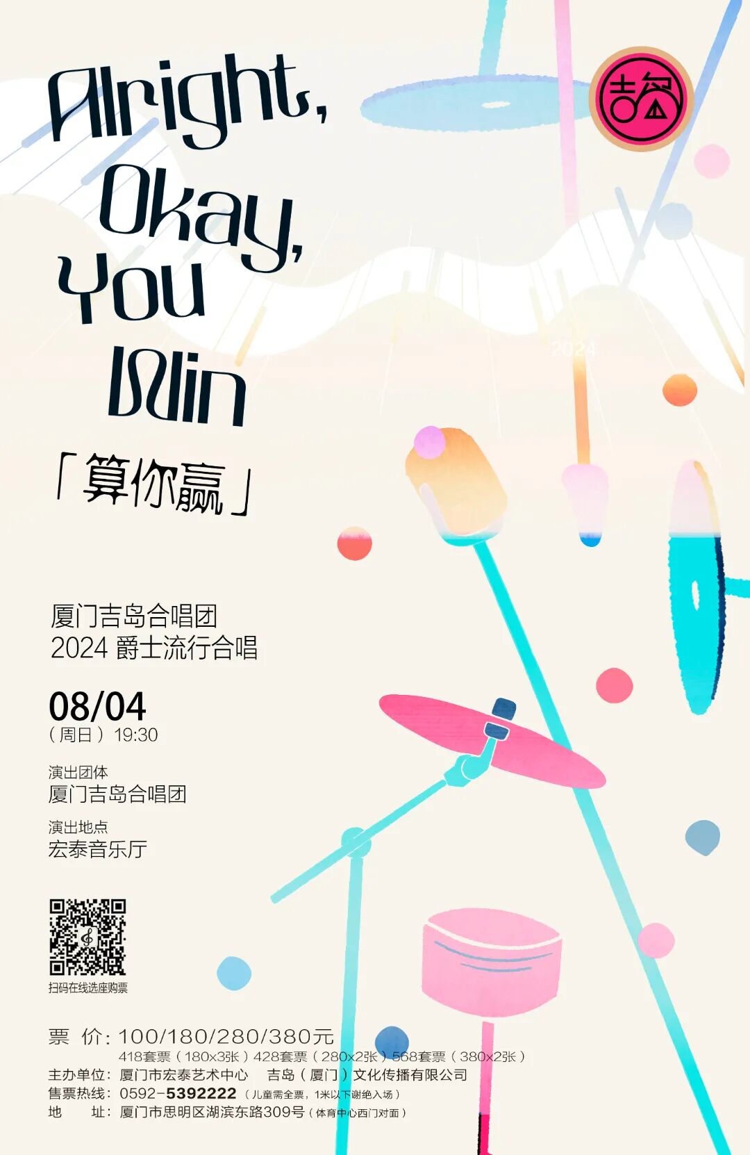 厦门吉岛合唱团将于8月举办两场「算你赢」爵士流行合唱专场音乐会,信息如下: