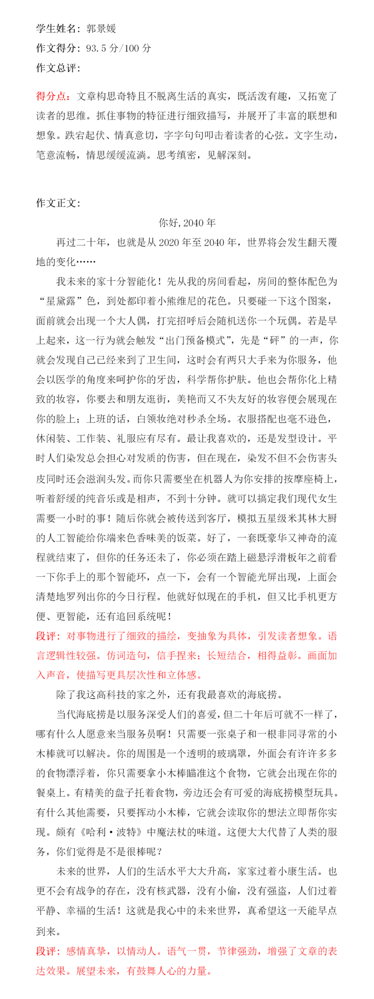 2、结合现在人们未满足的生活要求叙述了自己所想要的未来生活,以家内环境为例有条理。的介绍了自己脑海中的未来。