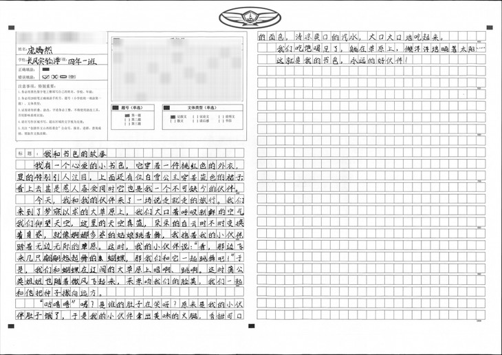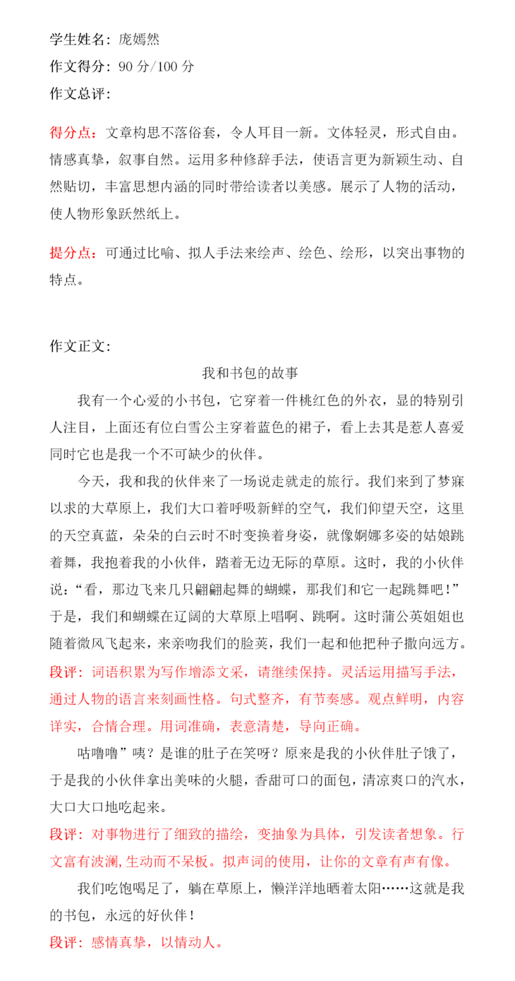 本篇文章的语言和意境都非常好,颇有几分婉约清丽之感。全文营造了一种幸福,快乐的氛围。构思新颖,情感真挚,把小书包看作了自己形影不离的好伙伴,在大草原上自由自在的心情跃然纸上。足见小作者的文笔功底之深厚,佳作!