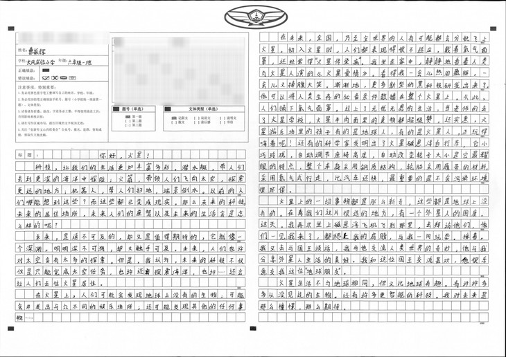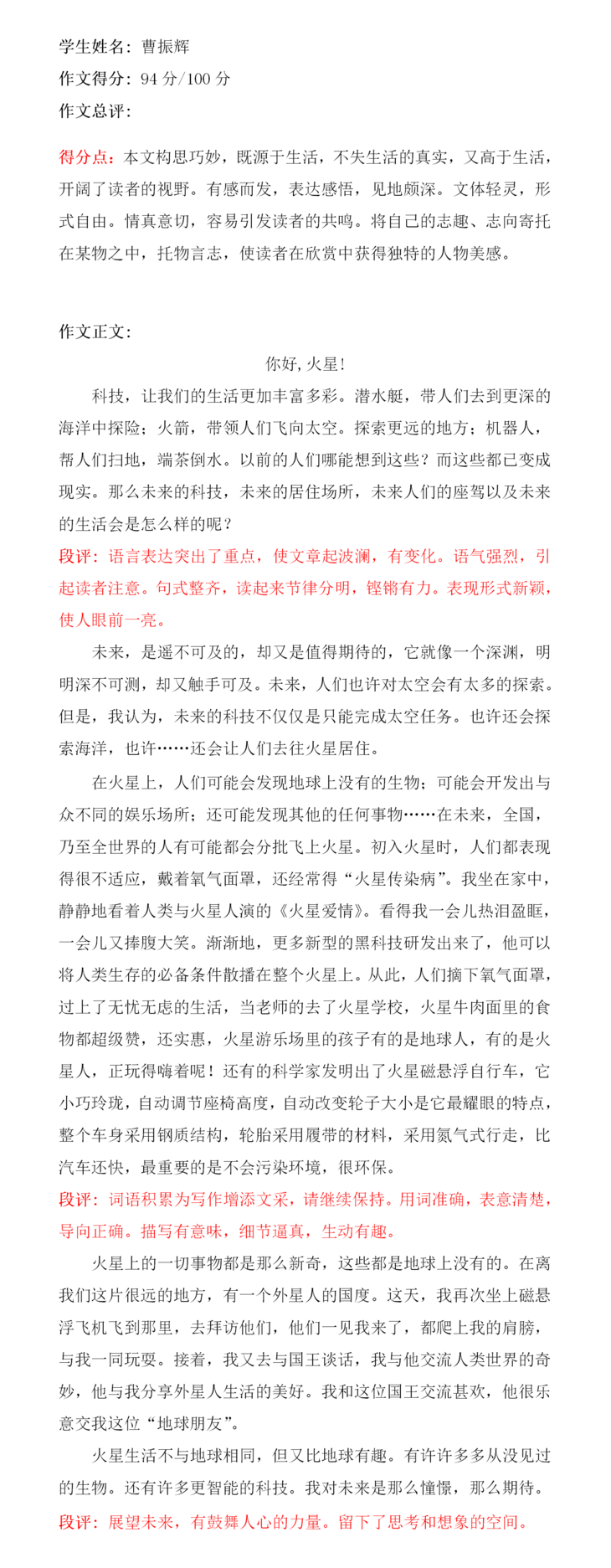 本文题材为想象文,在选定内容时充分发挥了想象,重点描写了科技的进步和未来人们在火星上的生活,表达出了小作者对未来火星生活的向往与憧憬。