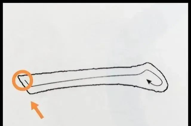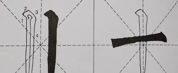 所以,切笔入纸的部分就形成了一个角度,能把这个角度的轮廓写好了,才不算败笔。竖画也一样,切笔入纸也是笔锋轻轻向左下落笔再折锋向右顿笔,然后再铺笔向下缓行。见下图。