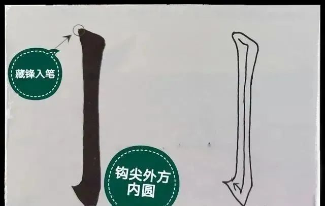能否写好钩尖,是毛笔书法功底的直接检验。无论是写竖钩,竖弯钩,还是戈钩,或者卧钩,钩尖写不好,基本就算败笔了!也暴露了笔者的书法功底。比如,竖钩,戈钩的写法,其钩的部位应该是内圆外方,如下图。钩尖可长可短,根据笔画需要来写。
