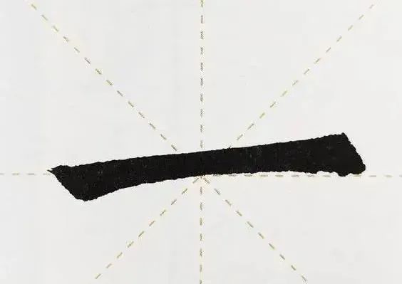 这是很多初学者常见的败笔之处。写毛笔字与写硬笔书法是有所区别的,这种区别就是切笔入纸角度严肃性不同,硬笔书法,要求不高,但毛笔不一样。比如长横画,切笔入纸的角度是45℃左右比较合适,如下图横画。而且,切入过程是先轻后重,顿笔折锋后再向右铺笔,然后中锋行笔。