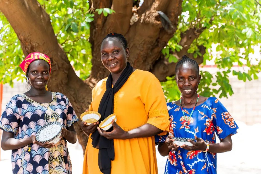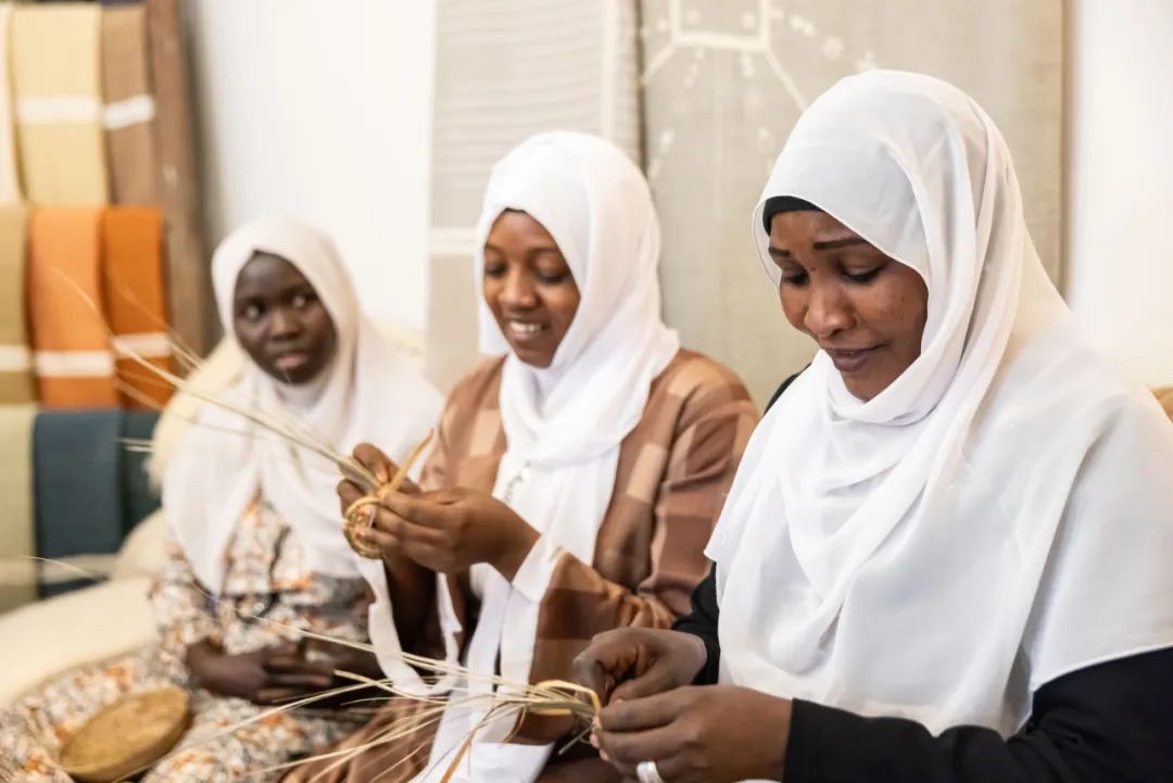 从左至右:阿齐扎·阿卜卡尔(Aziza Abkar)、塔耶巴·亚当(Tayeba Adam)、马赫迪娅·亚当(Mahdeya Adam)。三位来自苏丹的难民女性正在编织篮子。© UNHCR/Pedro Costa Gomes