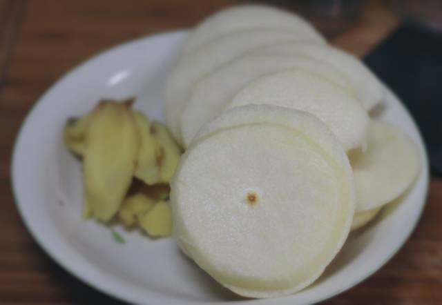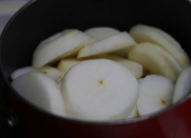 1、梨洗净去除黑靶儿,一分为二切开,顶刀切片待用;