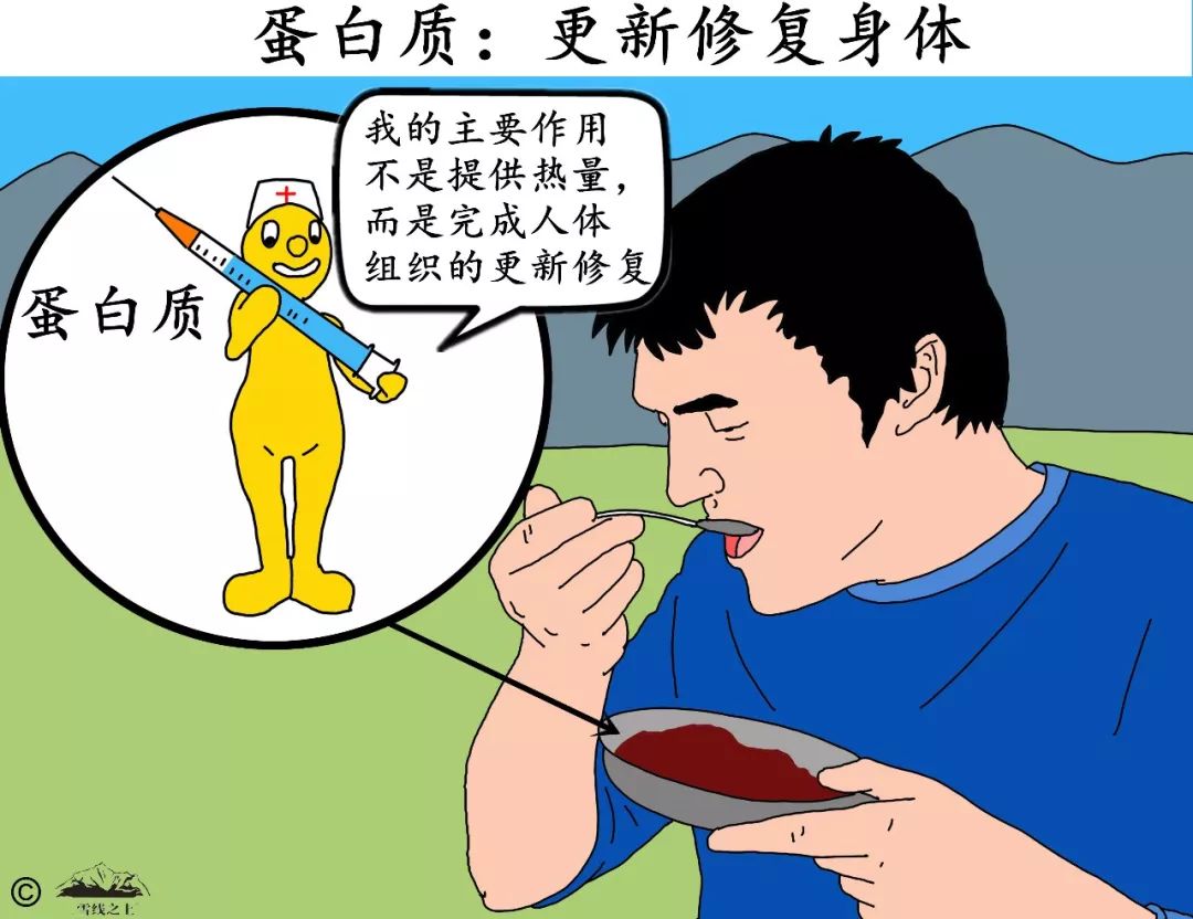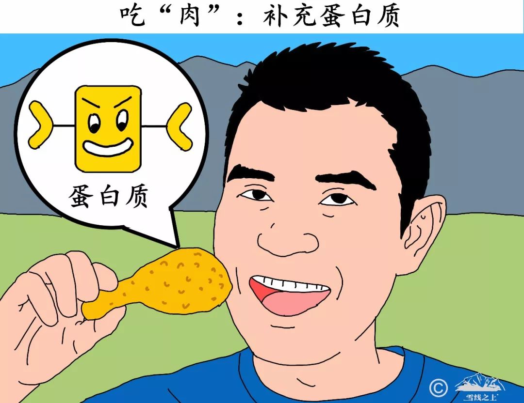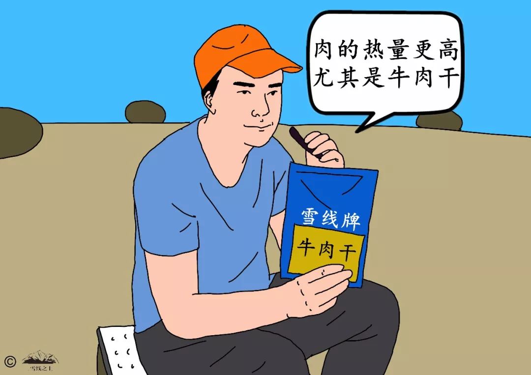 “面”主要提供的营养成分是碳水化合物,那“肉”所提供的也就是蛋白质了。“吃肉”也就是说在登山徒步时以蛋白质作为主要食物。