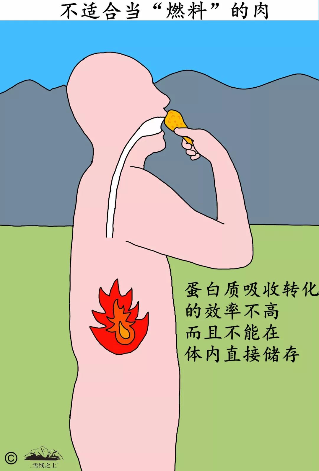 怎么吃“肉”——白天费力攀登时“肉”不适合作为主要食物。而在晚上吃“肉”,身体有充足的时间可以吸收并储存热量,以供之后的消耗。同时蛋白质转化成的脂肪还可以维持体温。