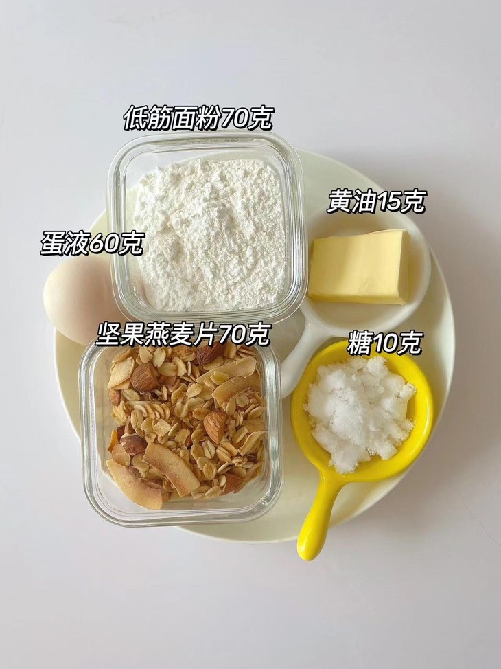 准备食材:面粉、黄油、糖、蛋液、坚果燕麦片