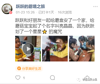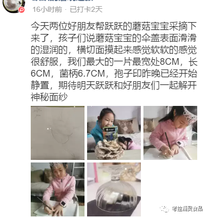 孩子们可以角色扮演,在玩的过程中,可以思考“蘑菇在什么环境下生长得比较快、观察蘑菇从1-7天的区别、什么样的蘑菇是可以吃的”。