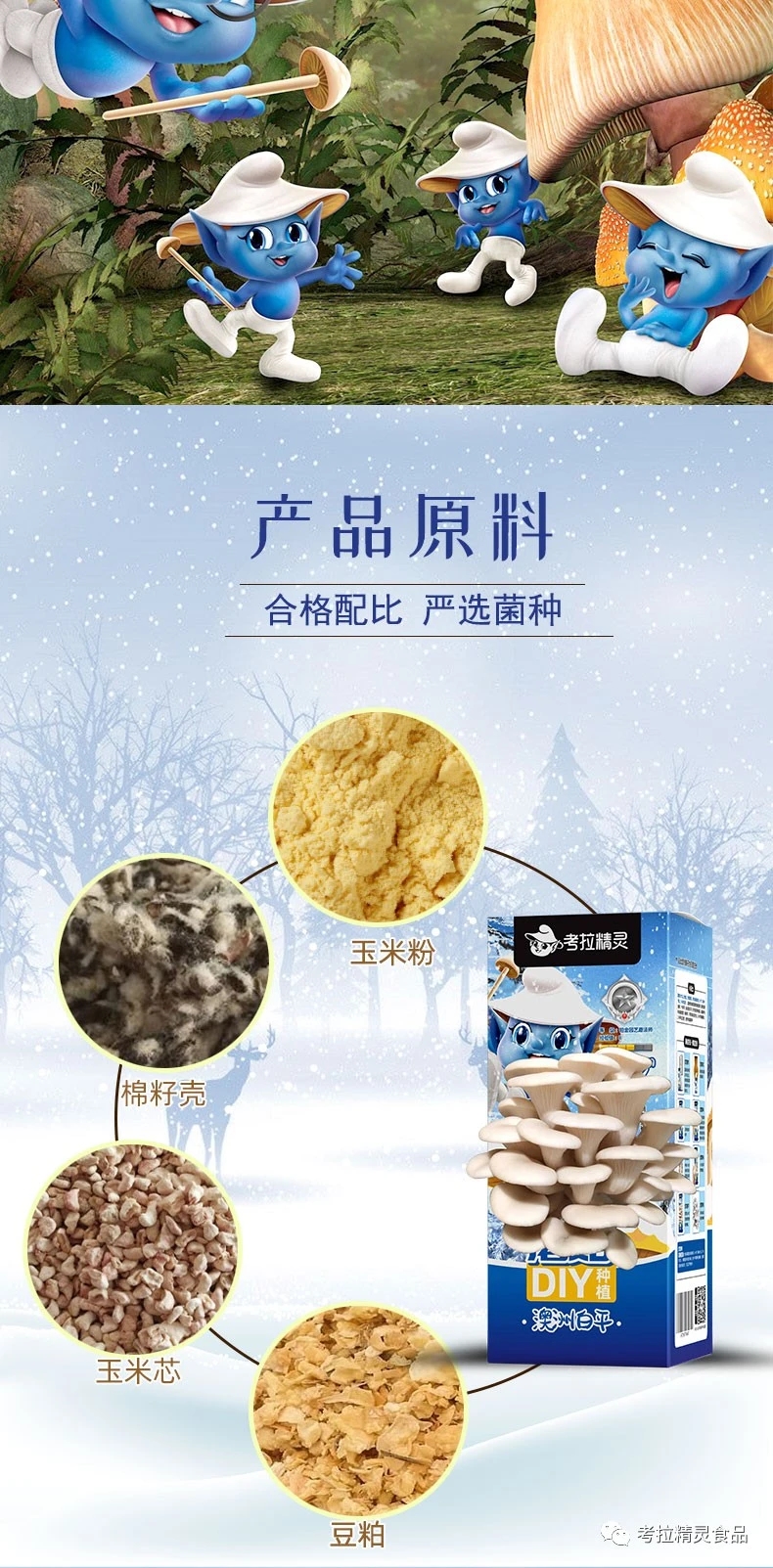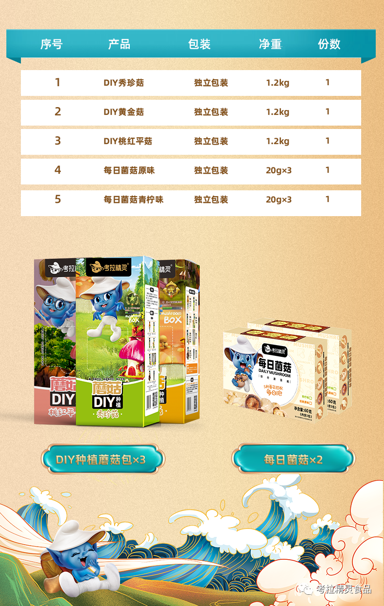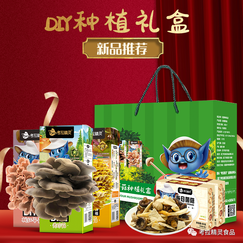 这套礼盒一共有5种产品,分别是DIY秀珍菇、DIY黄金菇、DIY桃红平菇、每日菌菇原味(即食)、每日菌菇青柠味(即食)
