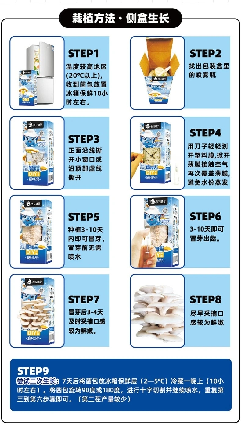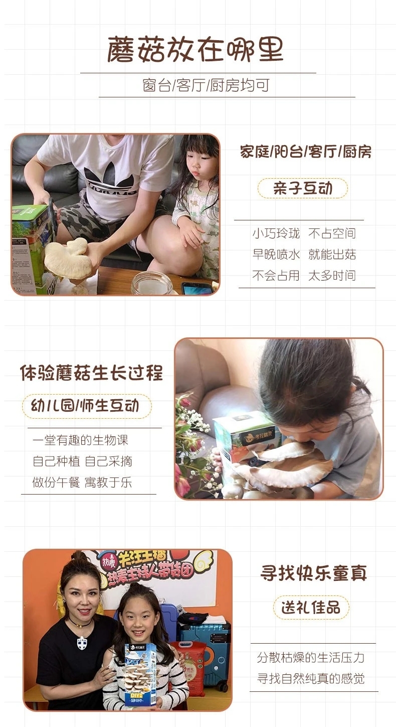 礼盒里有3种不同的菌包,孩子不但可以体验种植不同菌菇的乐趣,也可以送一份给好朋友,一起观察,一起学习~