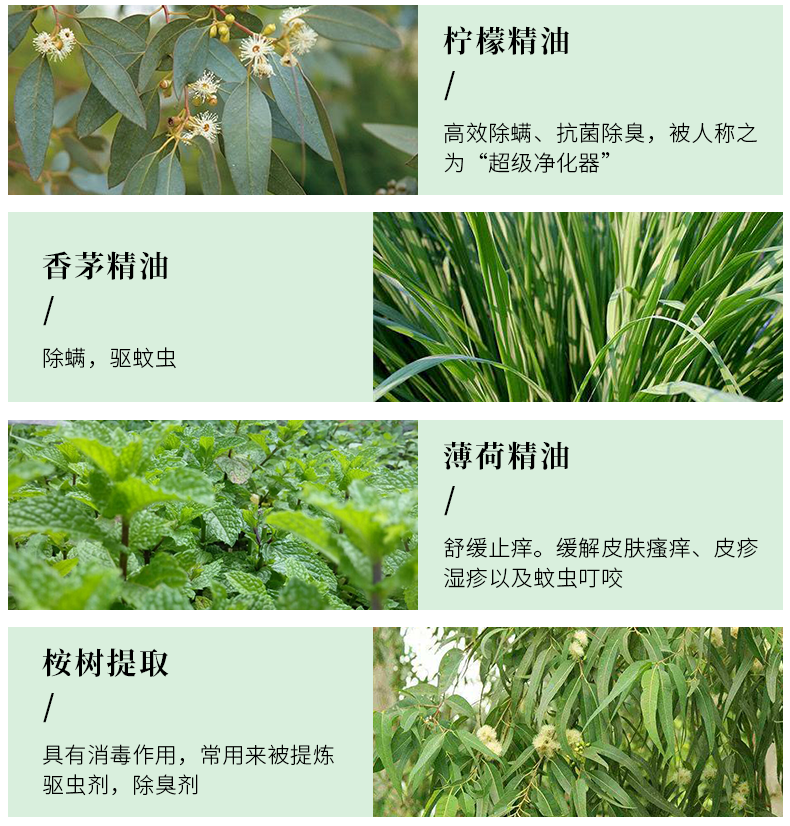 深入研究后发现,尤加利、香茅、桉树、薄荷这四种植物对螨虫有驱逐的功效。