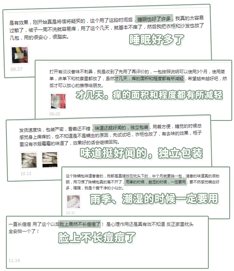 用过这款除螨包的人,都大家赞许,反馈说:“除螨效果好”、“鼻炎减轻了”、“身体不痒了”、“宝宝不再有红疹了”。