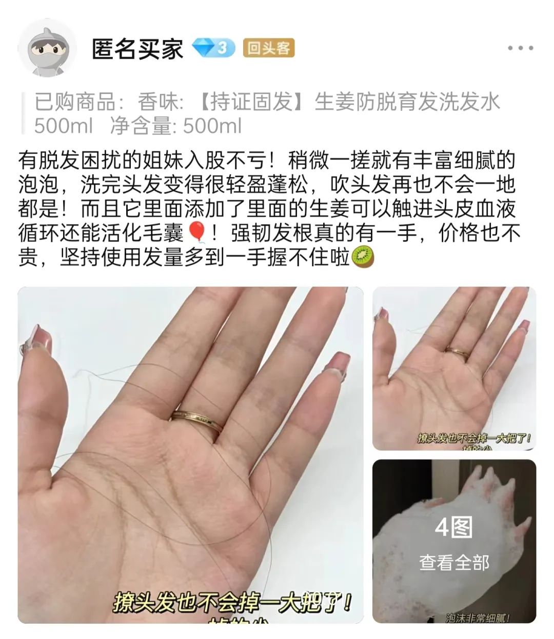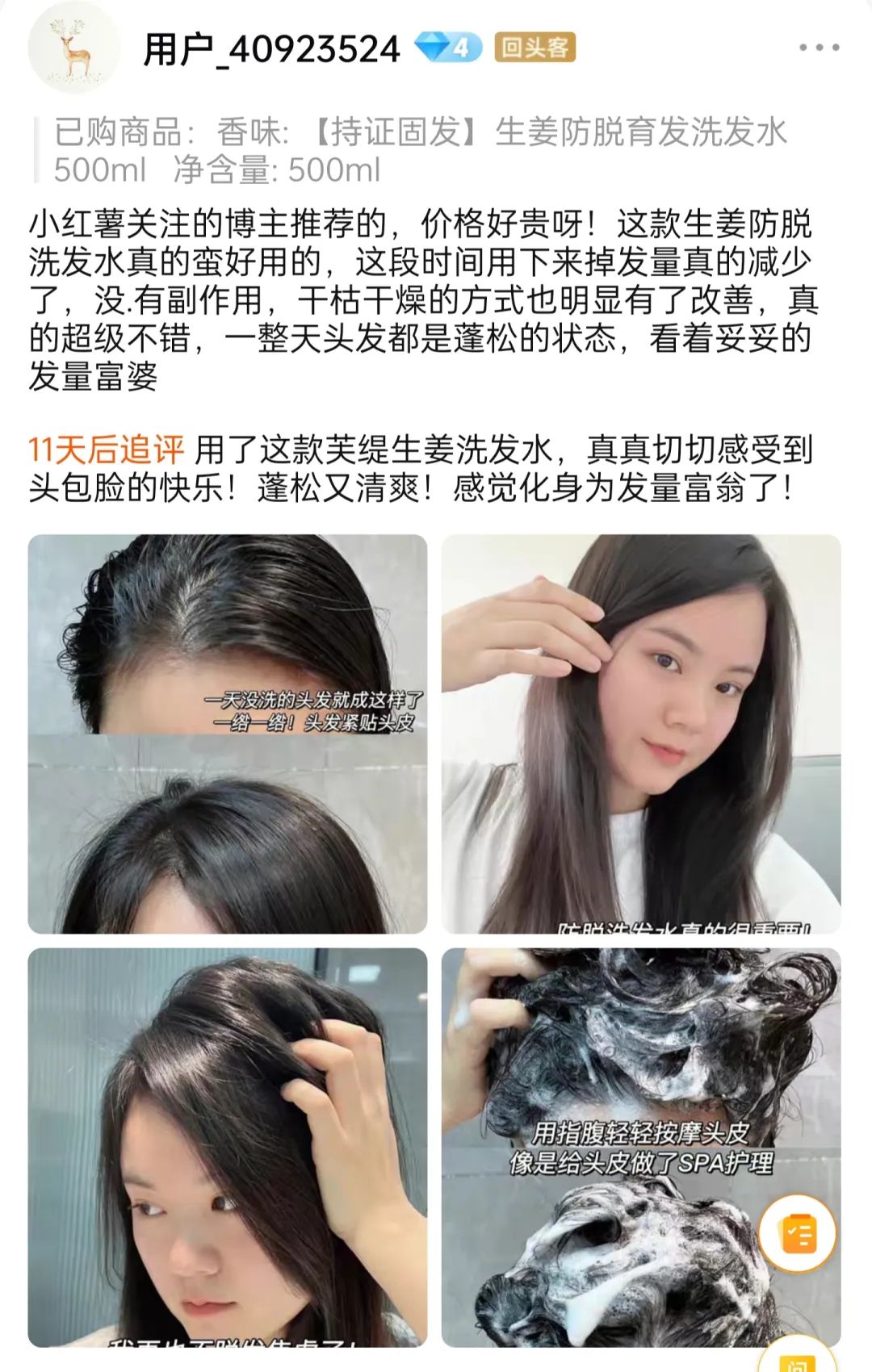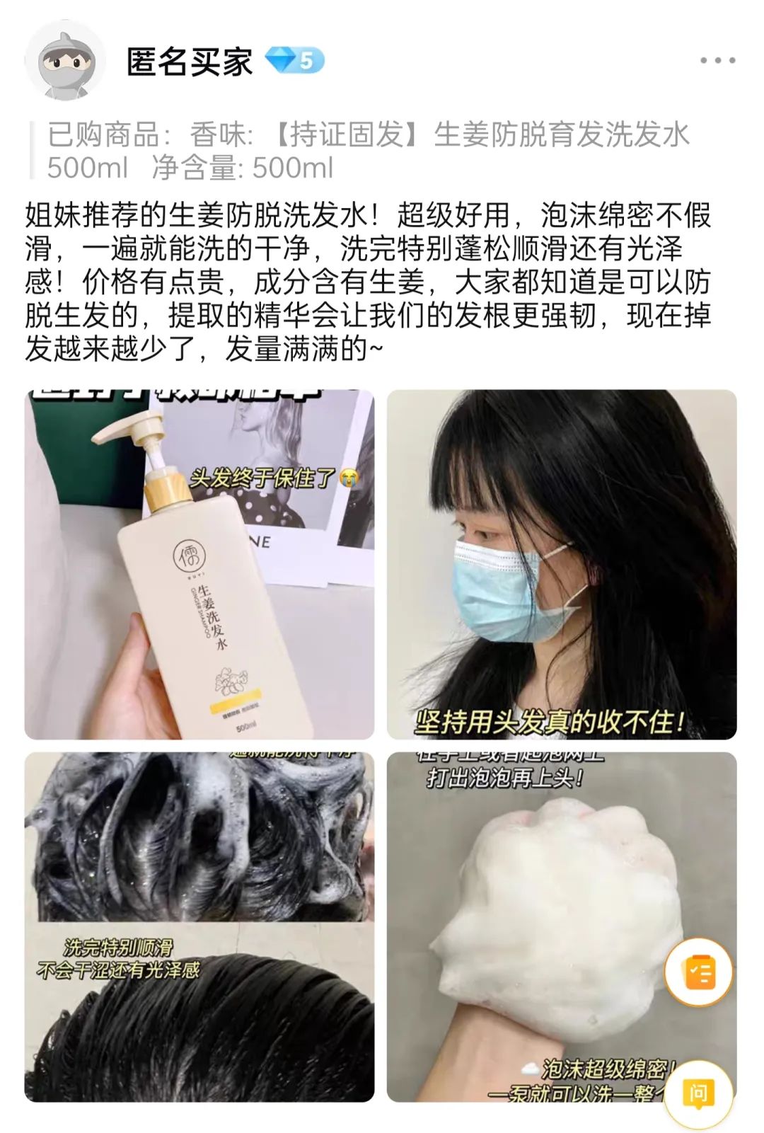 这款儒意生姜洗发水是老公做了非常多功课才入手的,好在洗完一瓶后,洗头基本不掉了,谢谢我老公这么贴心~
