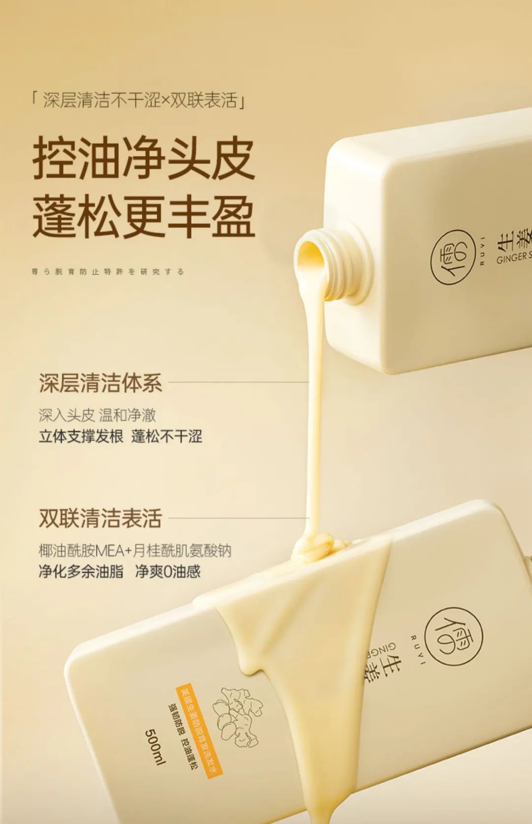 椰油酰胺MEA+月桂酰肌氨酸钠,深入头皮,温和净澈,净化多余油脂,净爽0油感,洗完不干涩!