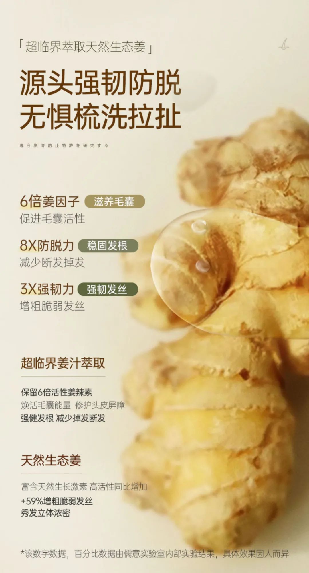 原料采用的是天然生态姜,富含天然生长激素,高活性同比增加+59%增粗脆弱发丝,让秀发立体浓密起来!