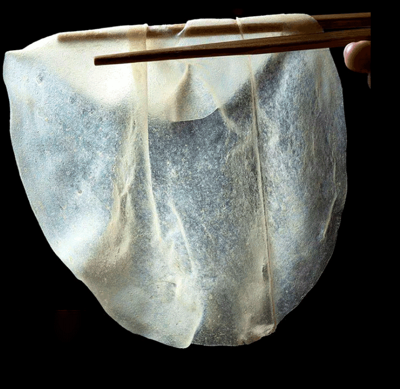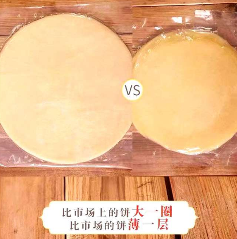 颜色金黄,油润细腻薄如蝉翼一张饼,看着就非常有食欲,薄而不破,透而不软。