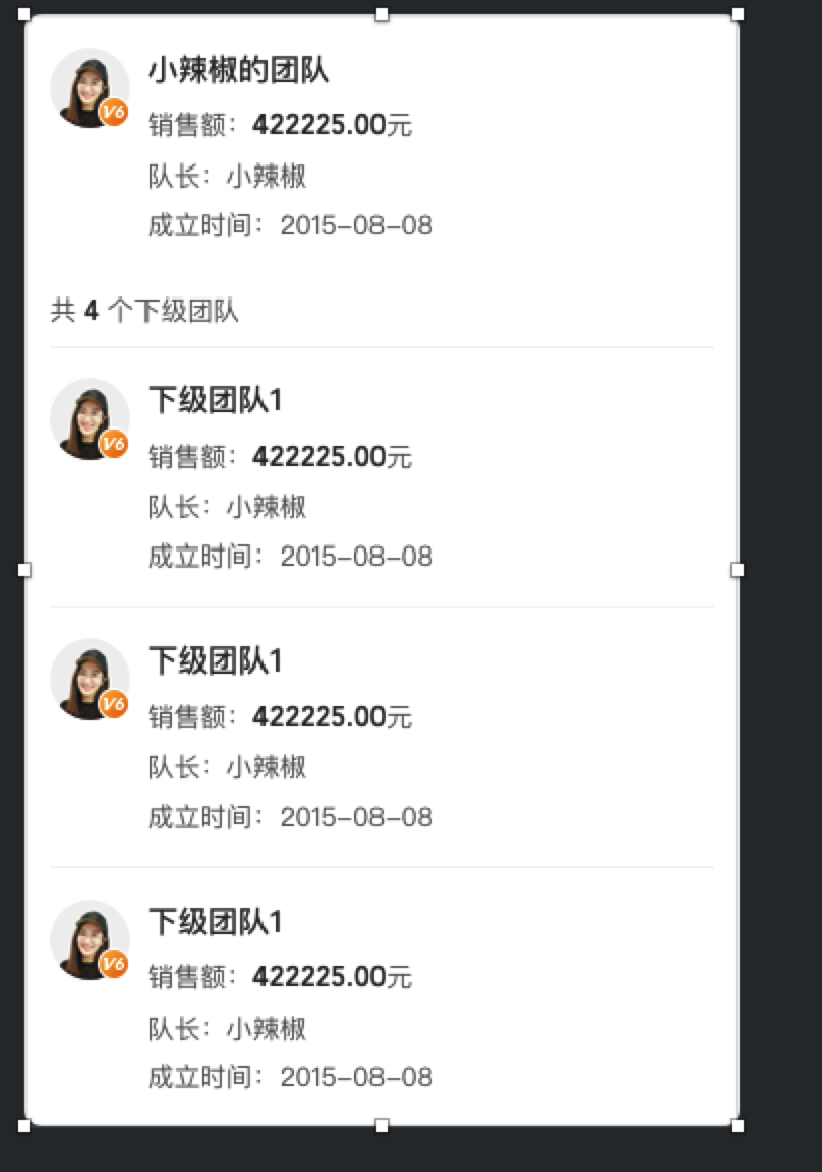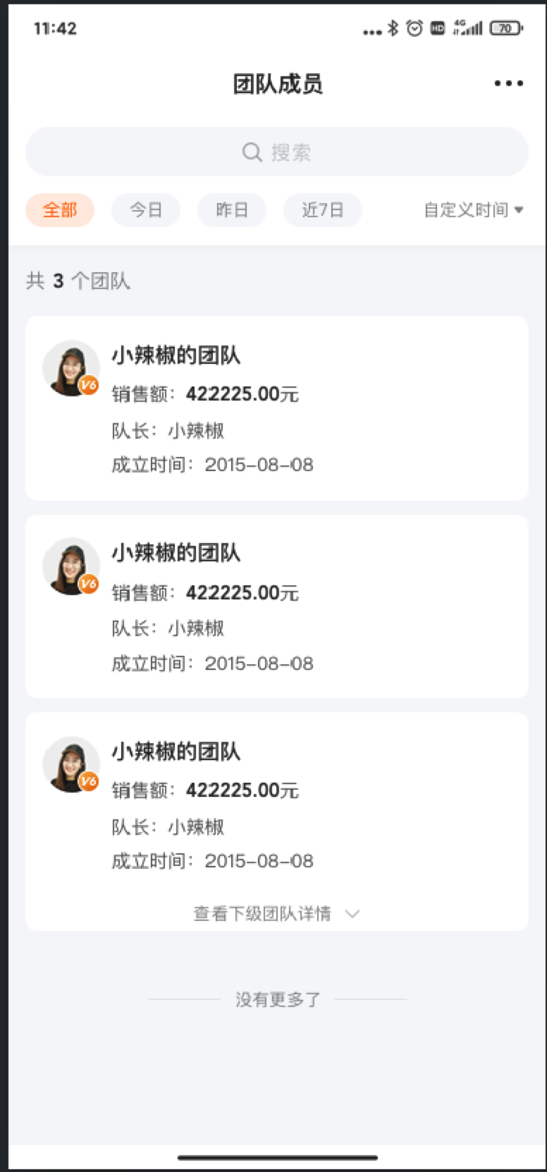 A的团队详情页,会展示a、b、c的队长、销售额、成员数、订单数