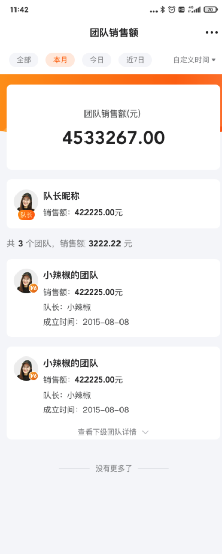 管理团队销售额会展示:队长本人销售额、直属下级团队销售额
