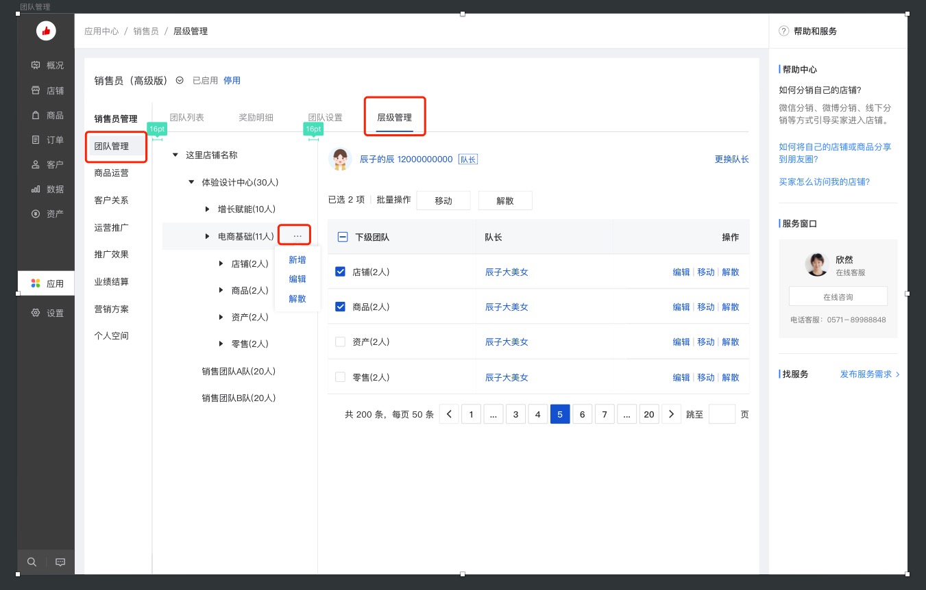 解散团队:解散的团队若无下级团队,解散后,该团多所有成员无归属。解散的团队如果有下级团队,可选择仅解散当前团队 或 解散当前团队以及其下级的所有团队。选择仅解散当前团队,其下级团队归属到上一级,若无上级团队,直接归属在店铺下。