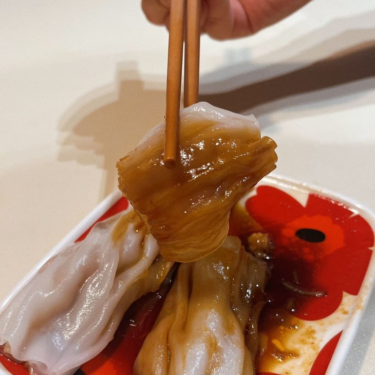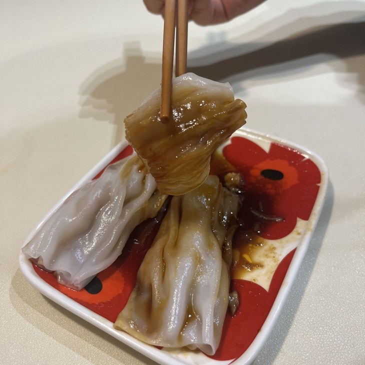 夹起粉皮包裹着馅料的肠粉送入口中