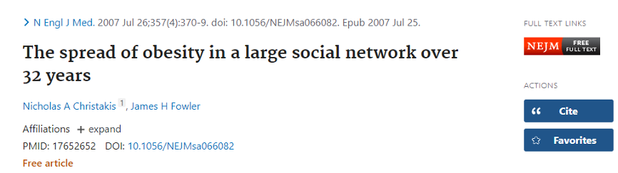 哈佛大学的科学家2007年刊发在《新英格兰医学杂志》上的一项研究,通过为期32年的追踪探究了肥胖是如何在社会网络中蔓延的。研究发现,肥胖真的会“传染”,而且会在家庭成员之间和朋友之间传播。