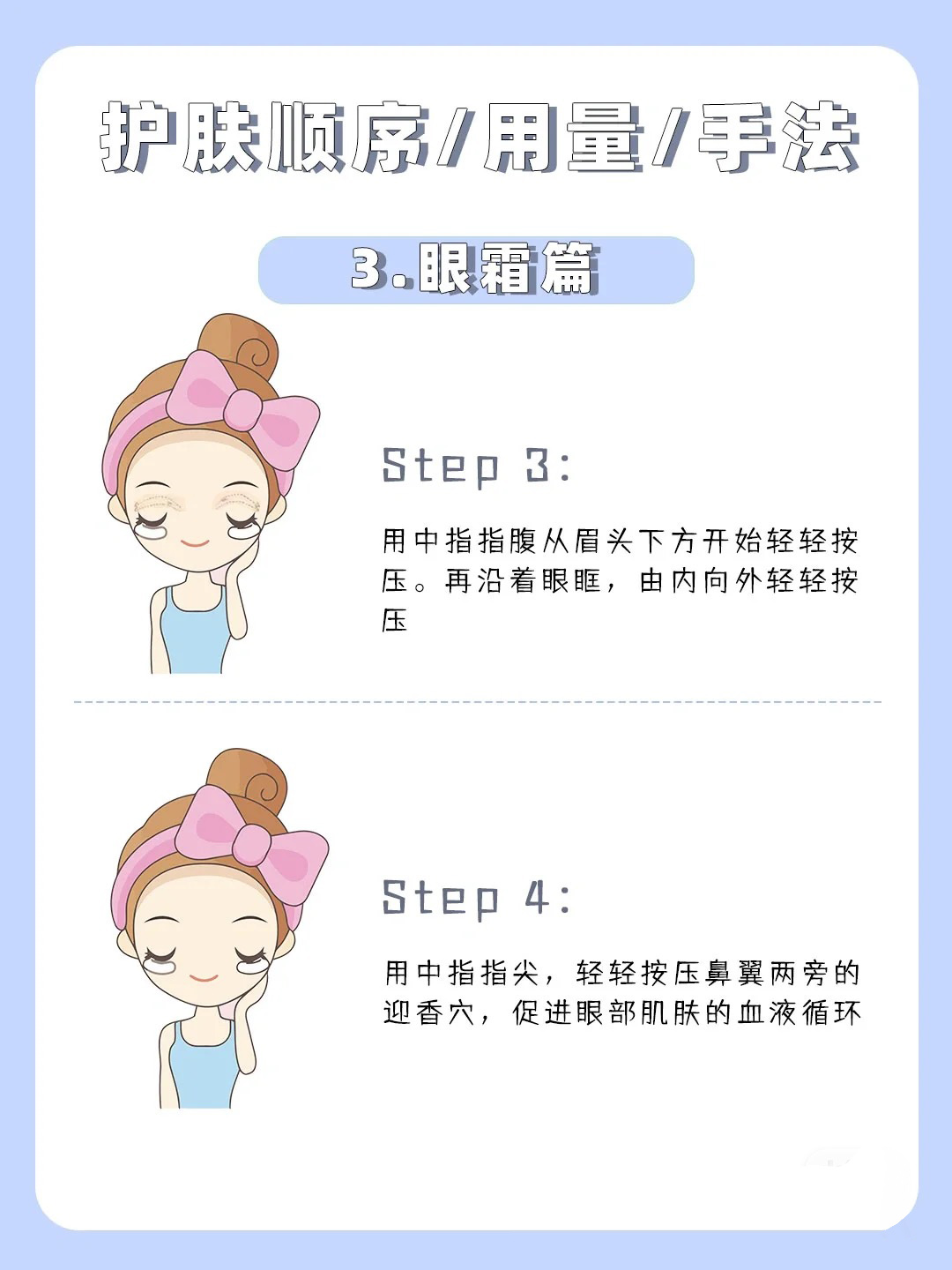 用你的手指取绿豆大小的眼霜在指间,然后再轻轻按摩至吸收