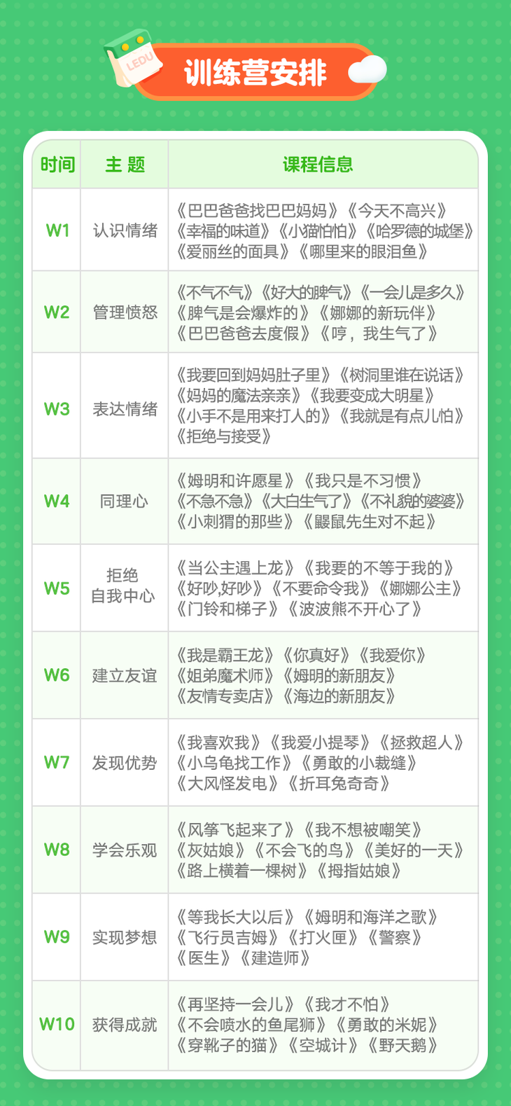 ▶训练营每周设置一个主题,十周覆盖孩子情绪→社交→自控→抗挫四大板块能力💨