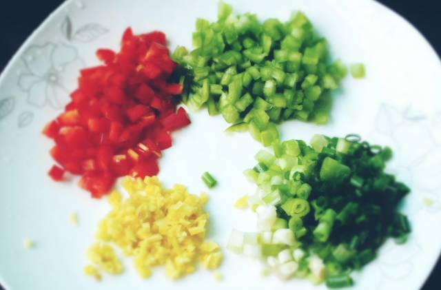 1、热锅凉油,微微起烟,放入适量青红椒米、洋葱米、蒜末,炒出香味;