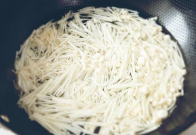 4、金针菇入锅,焯水1分钟捞出备用,下入油麦菜焯水捞出备用;