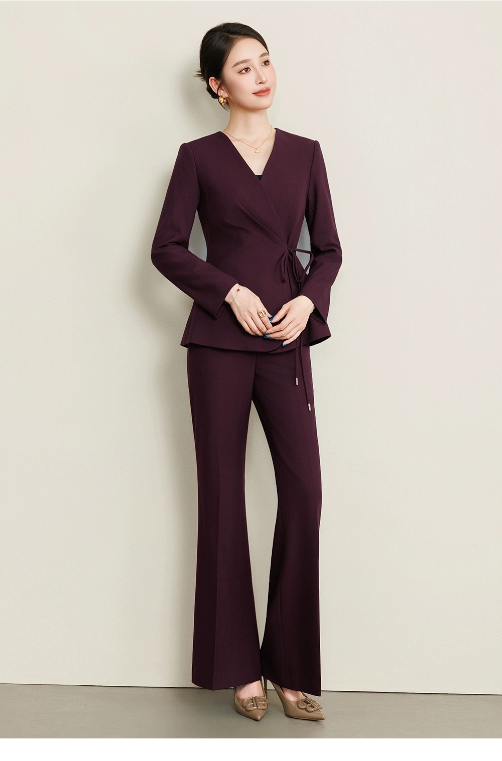 上衣的 V 领收腰设计,