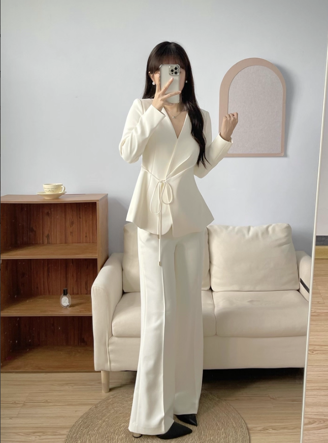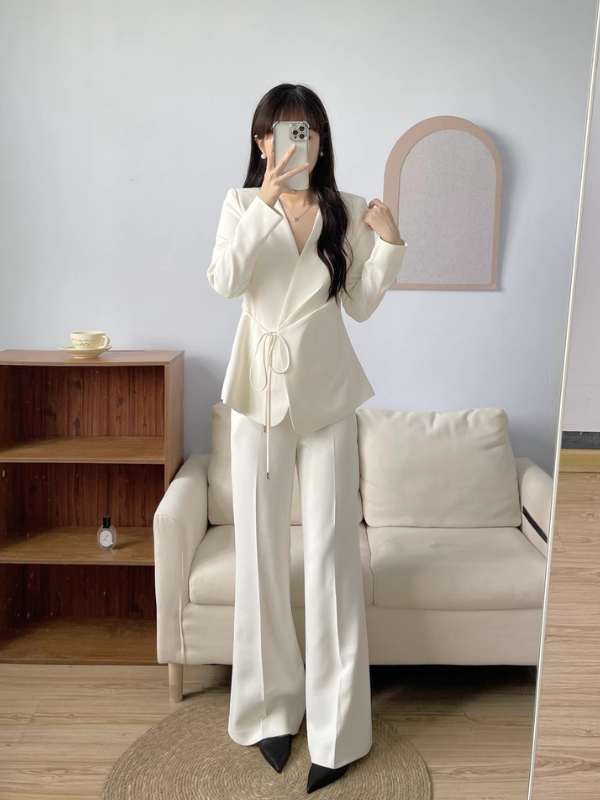 侧边的绑带轻轻一系便能收束腰线,将女性曲线温柔勾勒,打破“西装=刻板”的固有印象,新中式的含蓄雅致与现代设计的利落感在此交融。